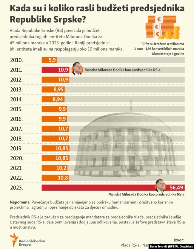 Budžet predsjednika Republike Srpskea je duže od decenije iznosio oko pet miliona eura, da bi doživio pravu “eksploziju” kada se Dodik vratio na ovu funkciju krajem 2022. godine.