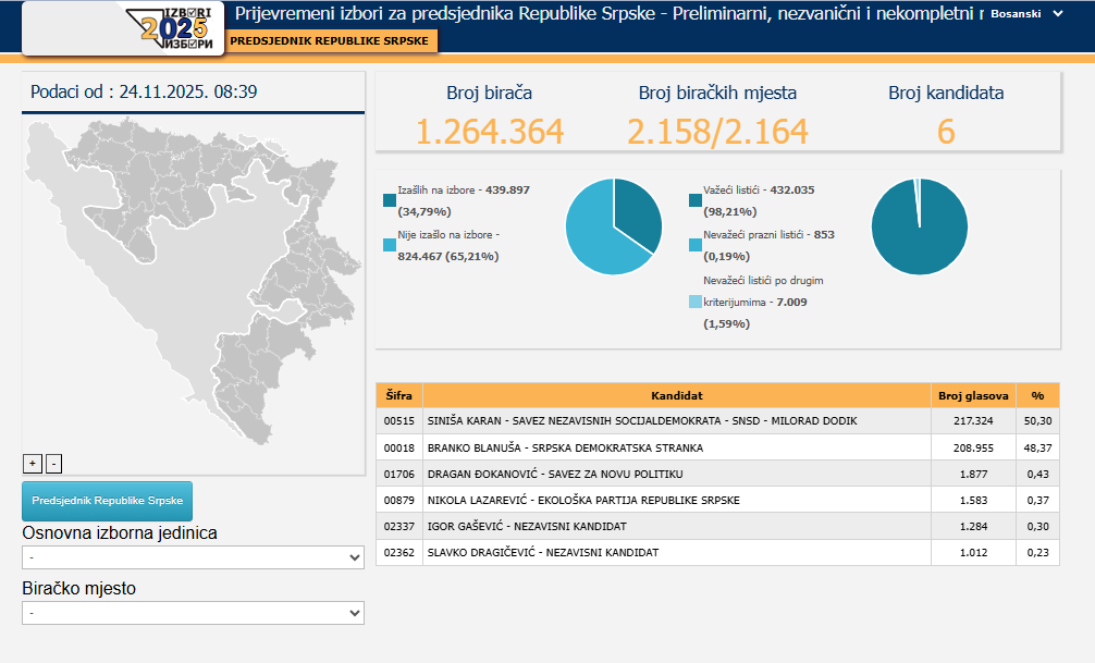 Centralna izborna komisija Bosne i Hercegovine objavila je ažurirane, preliminarne rezultate vanrednih izbora za predsjednika entiteta Republika Srpska, prema kojima je SNSD-ov Siniša Karan i dalje u vodstvu ispred kandidata SDS-a Branka Blanuše.