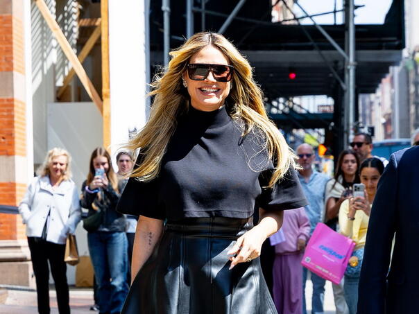 The supermodel stepped out in a bold black crop top, a sleek leather mini skirt, and sky-high heels—proving once again she’s still got it.