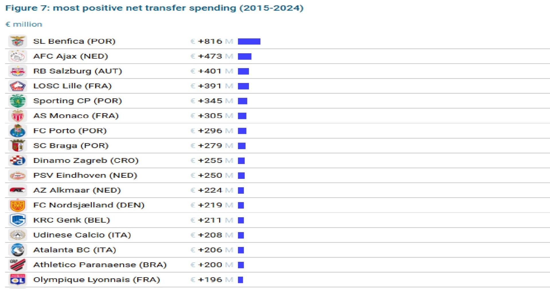 Tabelu predvodi klub koji je specijalizovan za velike izlazne transfere, a to je portugalska Benfica koja je zabilježila 816 miliona profita, odnosno razlike u ukupnoj svoti između izlaznih i ulaznih transfera.