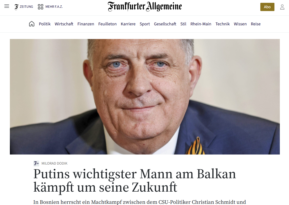 Prekretnicu je donio sukob s Christianom Schmidtom, visokim predstavnikom međunarodne zajednice u BiH. U julu 2023. Schmidt je, koristeći bonske ovlasti, uveo odredbu prema kojoj se nepoštivanje njegovih odluka kažnjava zatvorskom kaznom do pet godina, bez mogućnosti žalbe. Na osnovu toga, državne institucije u Sarajevu optužile su Dodika zbog nepoštivanja Schmidtovih odluka. U februaru ove godine osuđen je u prvostepenom postupku, a početkom augusta pravosnažno na godinu dana zatvora, jer je, između ostalog, inicirao zakon kojim bi Ustavni sud BiH izgubio nadležnost u RS-u. Schmidt je taj zakon poništio, no Dodik ga je ignorisao, navodi FAZ.