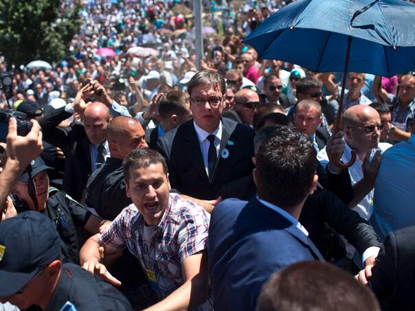 Ali događaj je dobio sasvim drugačiji tok. Nakon što je Clinton položio vijenac, Vučić je položio cvijet, ali ubrzo je atmosfera eskalirala. Započelo je dobacivanje, a zatim su prema Vučiću poletjele boce i kamenje. Gledajući snimke danas, čudo je da niko nije ozbiljno povrijeđen.