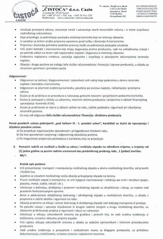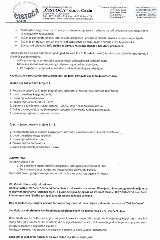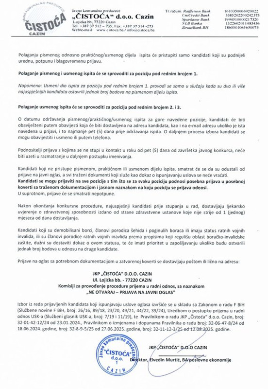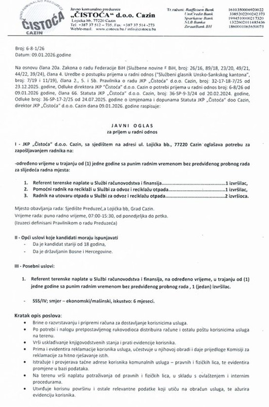 JKP “Čistoća” d.o.o. Cazin objavilo je javni oglas za zapošljavanje novih zaposlenika na određeno vrijeme, potvrdili su iz ovog gradskog komunalnog poduzeća. Natječaj je otvoren na temelju Zakona o radu Federacije Bosne i Hercegovine, Pravilnika o radu Društva i relevantnih internih odluka tvrtke.