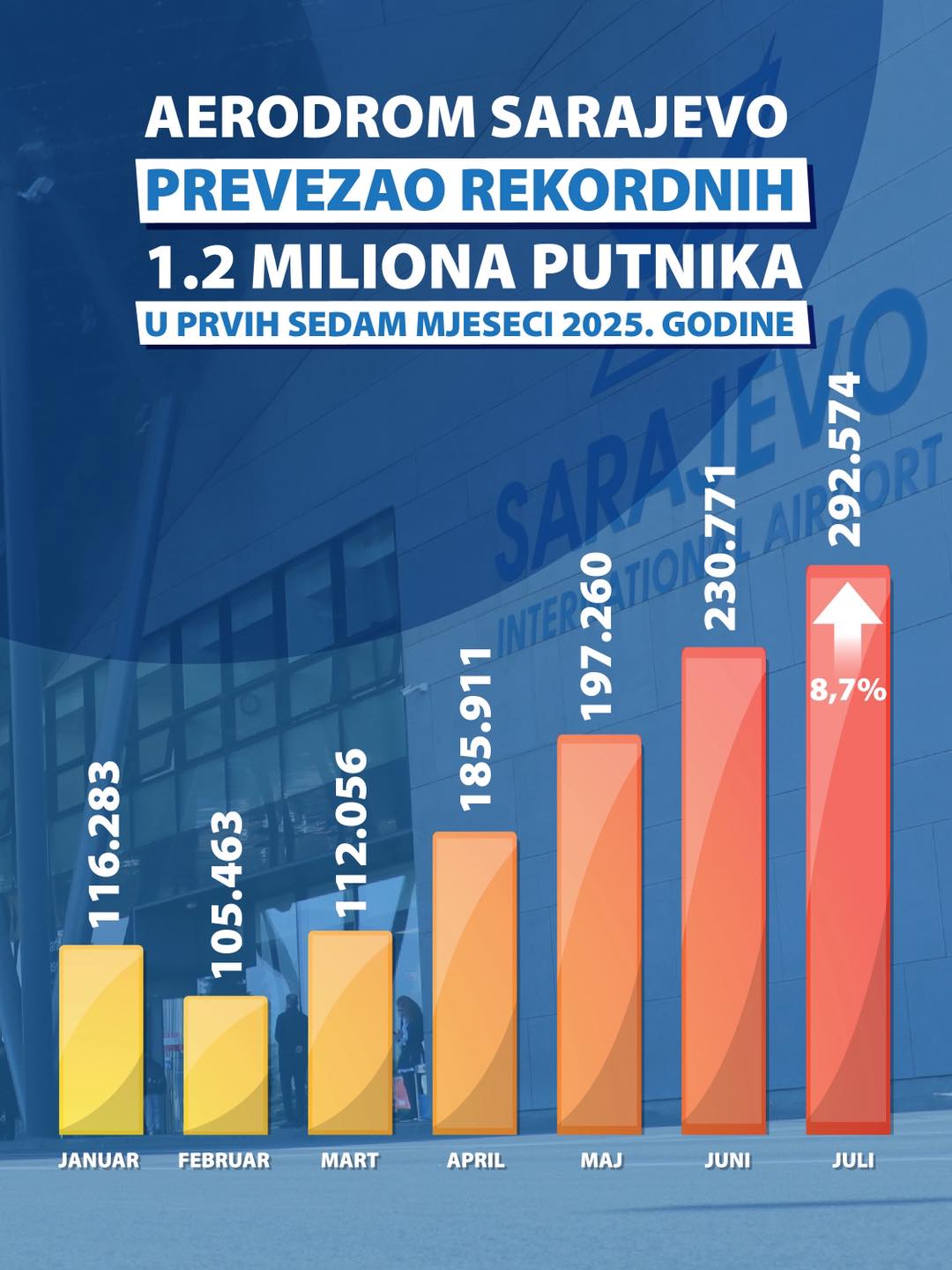 U prvih sedam mjeseci 2025. godine, Međunarodni aerodrom Sarajevo zabilježio je više od 1.2 miliona prevezenih putnika. Samo u julu 2025. godine kroz sarajevski aerodrom prošlo je 292.574 putnika, 8,7% više nego u julu 2024. godine. Ovako snažan uzlet još jednom potvrđuje da je Sarajevo nezaobilazna destinacija na regionalnoj mapi, ali i da sve više naših građana koristi mogućnosti koje danas ima.