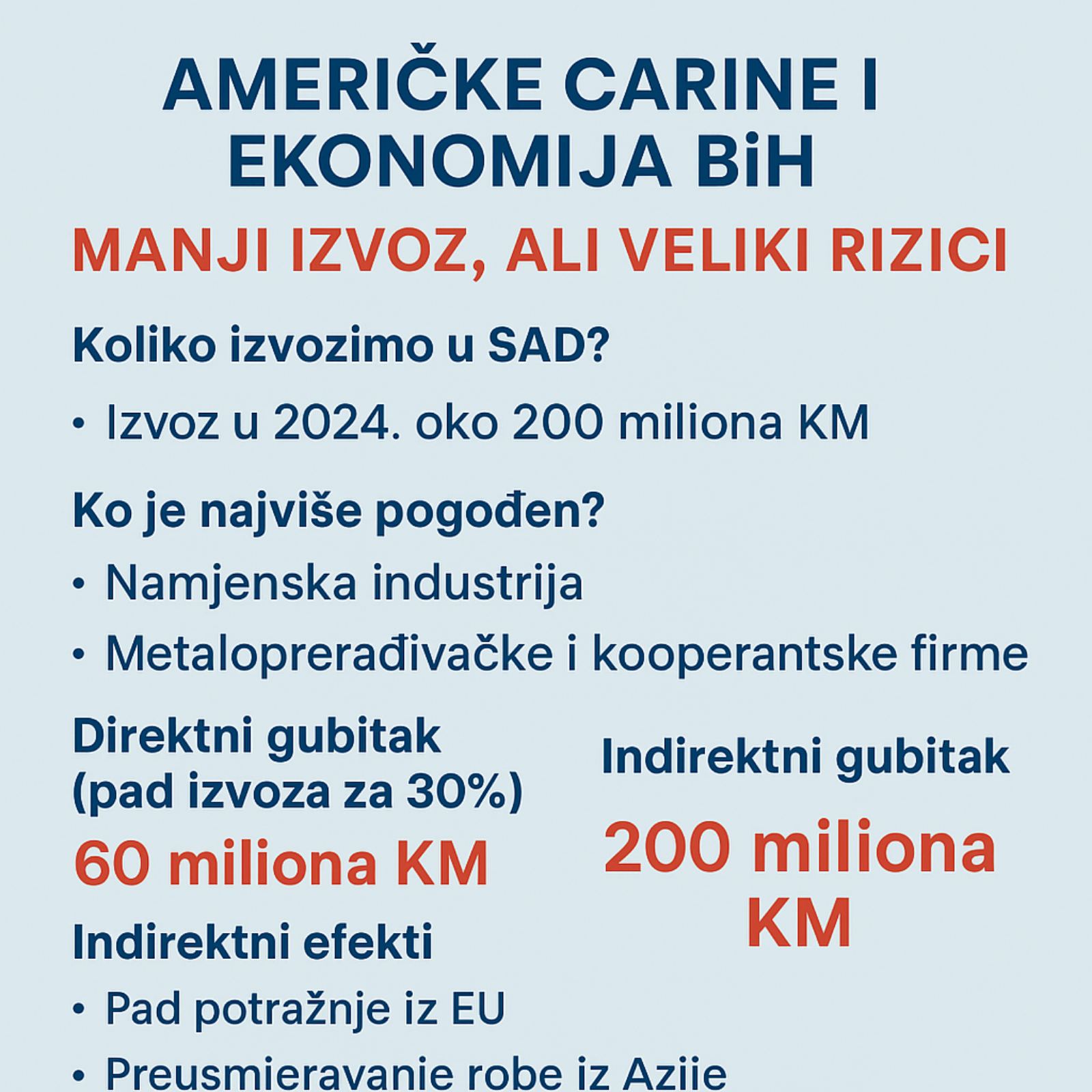 Iako BiH nije među najvećim izvoznicima u SAD, indirektni uticaji novih tarifa, koje dostižu i do 35%, mogli bi se osjetiti širom bh. privrede – od proizvodnih pogona do krajnjih potrošača.