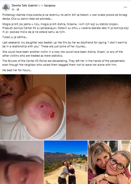 “Proteklog vikenda moja kćerka je za rečenicu- ne želim biti sa tobom u vezi ovako prošla od bivšeg dečka. Ovo su samo neke od povreda… Mogla je biti još jedna u nizu, mogla je biti Aldina, Nizama, i svih njih koji su statistički brojevi.