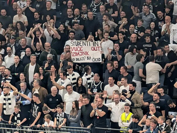 Đurović je u dvorani podigao transparent na kom je pisalo “Studenti IN, Vučić OUT, Izdajnik. Ko dolazi? BIA ćacad”, nakon čega je nastao pravi metež na tribinama.