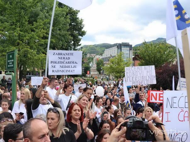 Radnici trgovine i uslužnih djelatnosti danas održavaju proteste ispred zgrade Doma sindikata na Skenderiji u Sarajevu.