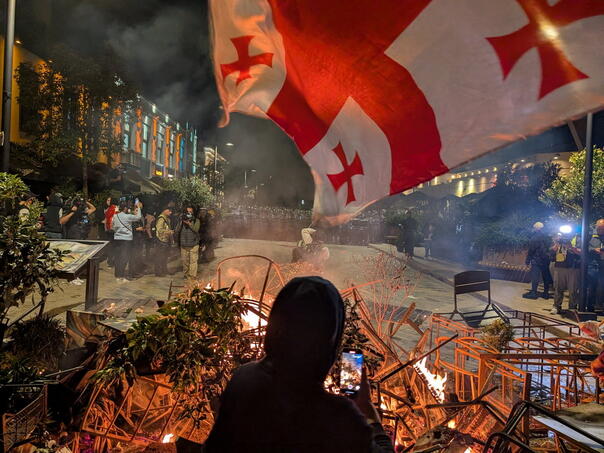 What's happening on the other side: Fire on Fkhovi Street. Protesters have erected barricades.