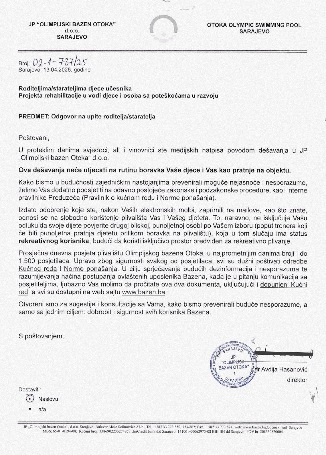 “U proteklim danima svjedoci, ali i vinovnici ste medijskih natpisa povodom dešavanja u JP „Olimpijski bazen Otoka” d.o.o. Ova dešavanja neće utjecati na rutinu boravka Vaše djece i Vas kao pratnje na objektu.