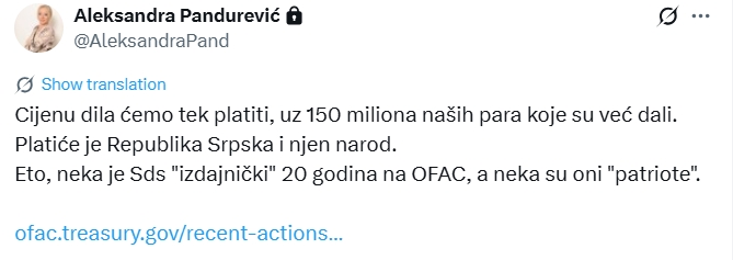 – Cijenu dila ćemo tek platiti, uz 150 miliona naših para koje su već dali. Platit će je RS i njen narod. Eto, neka je SDS “izdajnički” 20 godina na OFAC, a neka su oni “patriote” – navela je Pandurević.