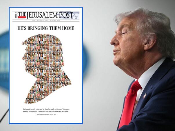 The Jerusalem Post marks this pivotal moment with a front cover featuring President Trump's silhouette filled with 48 hostage faces, paired with late PM Golda Meir's words: “Perhaps it is early yet to say ‘in the aftermath of the war,’ for we are living under a cease-fire.” pic.twitter.com/f40rZTUHS8