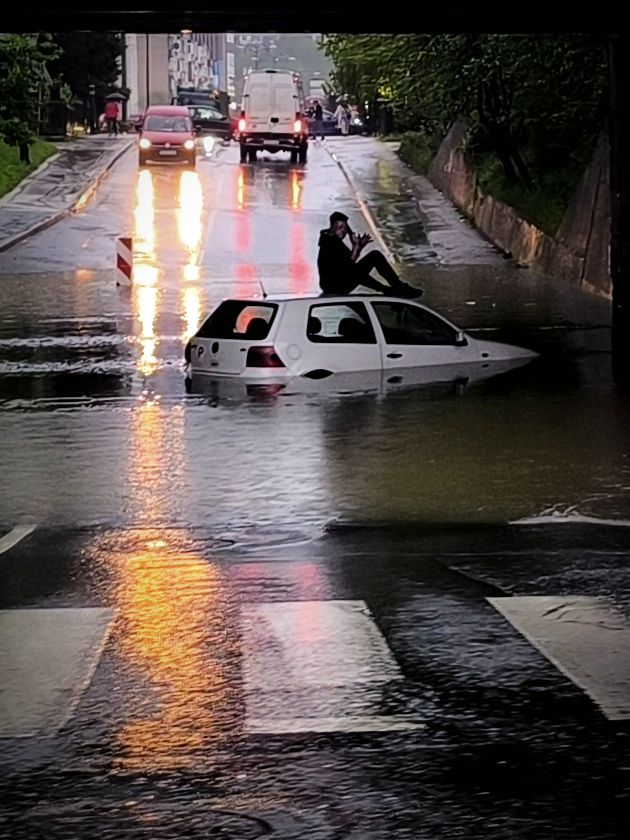 Jedan automobil ostao je zaglavljen u vodi, a vozač automobila popeo se na krov vozila.