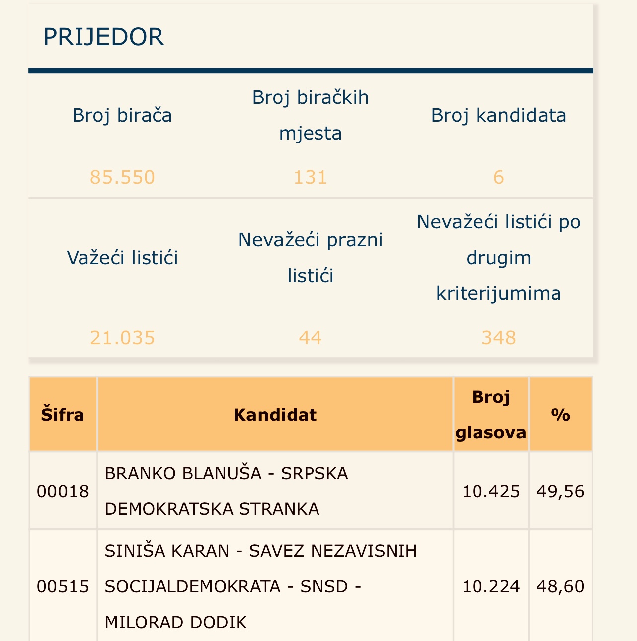U drugom najvećem gradu u entitetu RS, Bijeljini, razlika je oko 3 hiljada glasova. Blanuša je u Biljeljini dobio 20.655, dok je Karan dobio 17.781.
