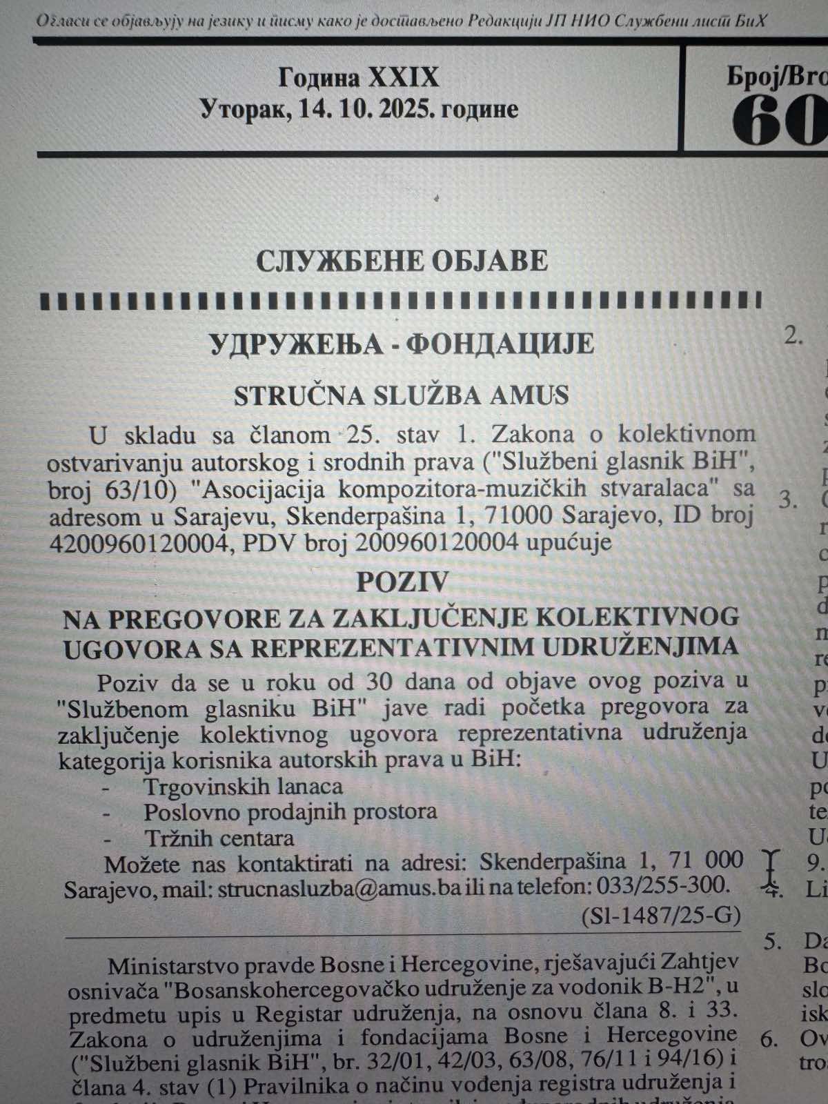 Podsjećamo, AMUS je poziv uputio reprezentativnim udruženjima korisnika autorskih prava, i to iz kategorija: trgovinski lanci, poslovno–prodajni prostori i tržni centri.
