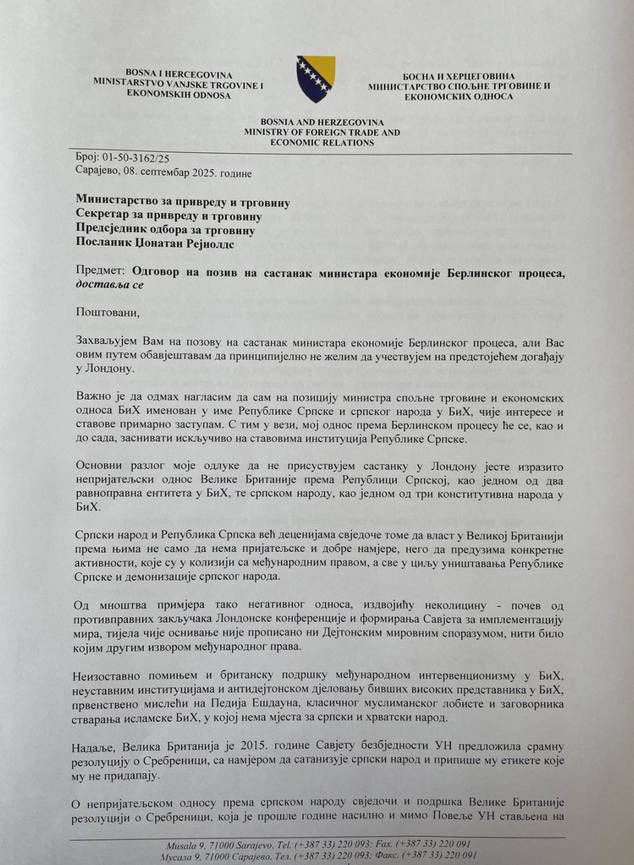 „Osnovni razlog moje odluke da ne prisustvujem sastanku u Londonu jeste izrazito neprijateljski odnos Velike Britanije prema RS-u, kao jednom od dva ravnopravna entiteta u BiH, te srpskom narodu, kao jednom od tri konstitutivna naroda u BiH“, naveo je Košarac u dopisu britanskom sekretaru za privredu i trgovinu Jonathanu Reynoldsu.