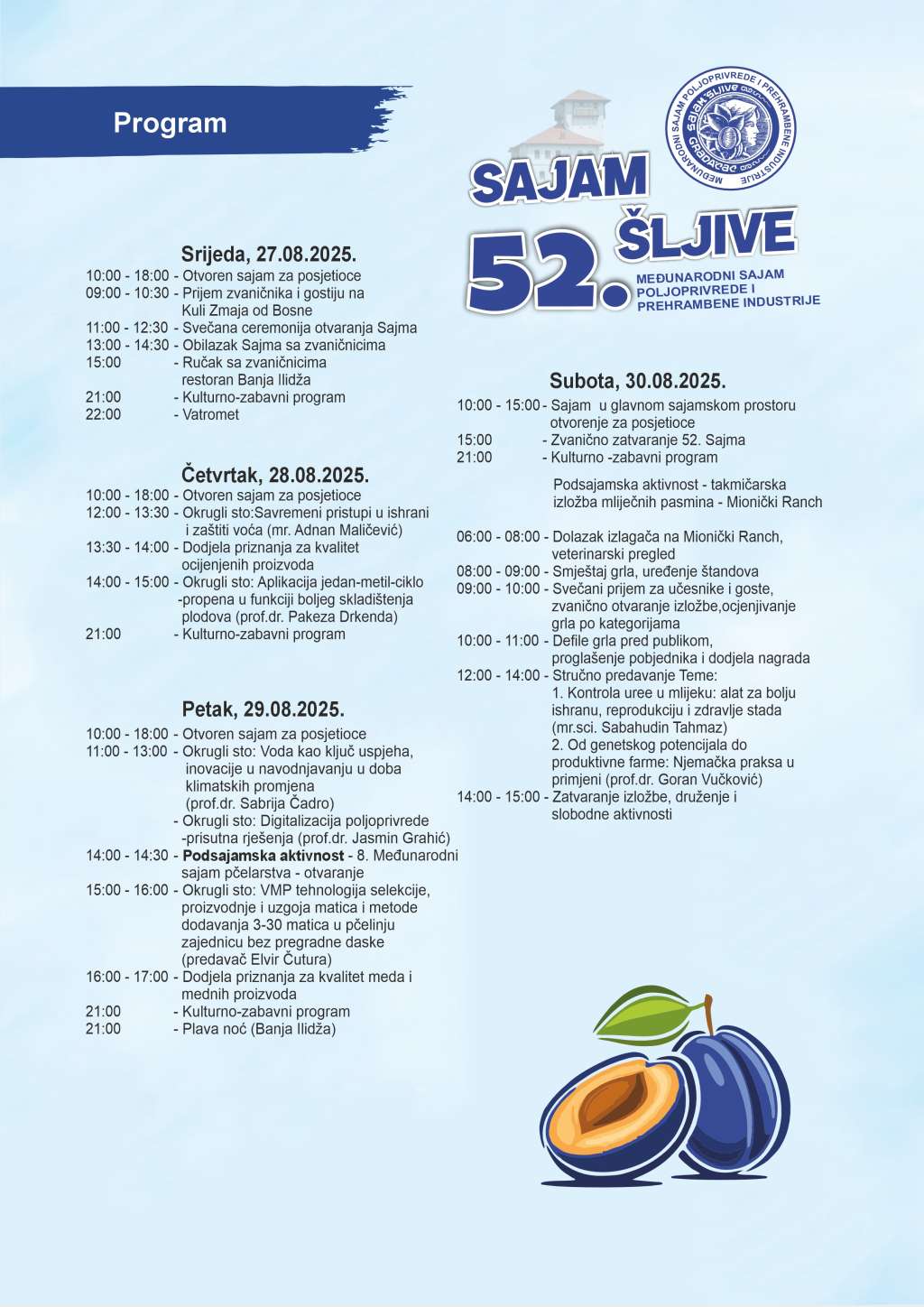Ovogodišnji Sajam šljive prilika je za poljoprivredne proizvođače i prerađivače hrane i pića da predstave prednosti i dostignuća u ovoj privrednoj grani. Sajam šljive će ponuditi brojne podsajamske sadržaje s međunarodnim učesnicima te niz stručnih i naučnih skupova.