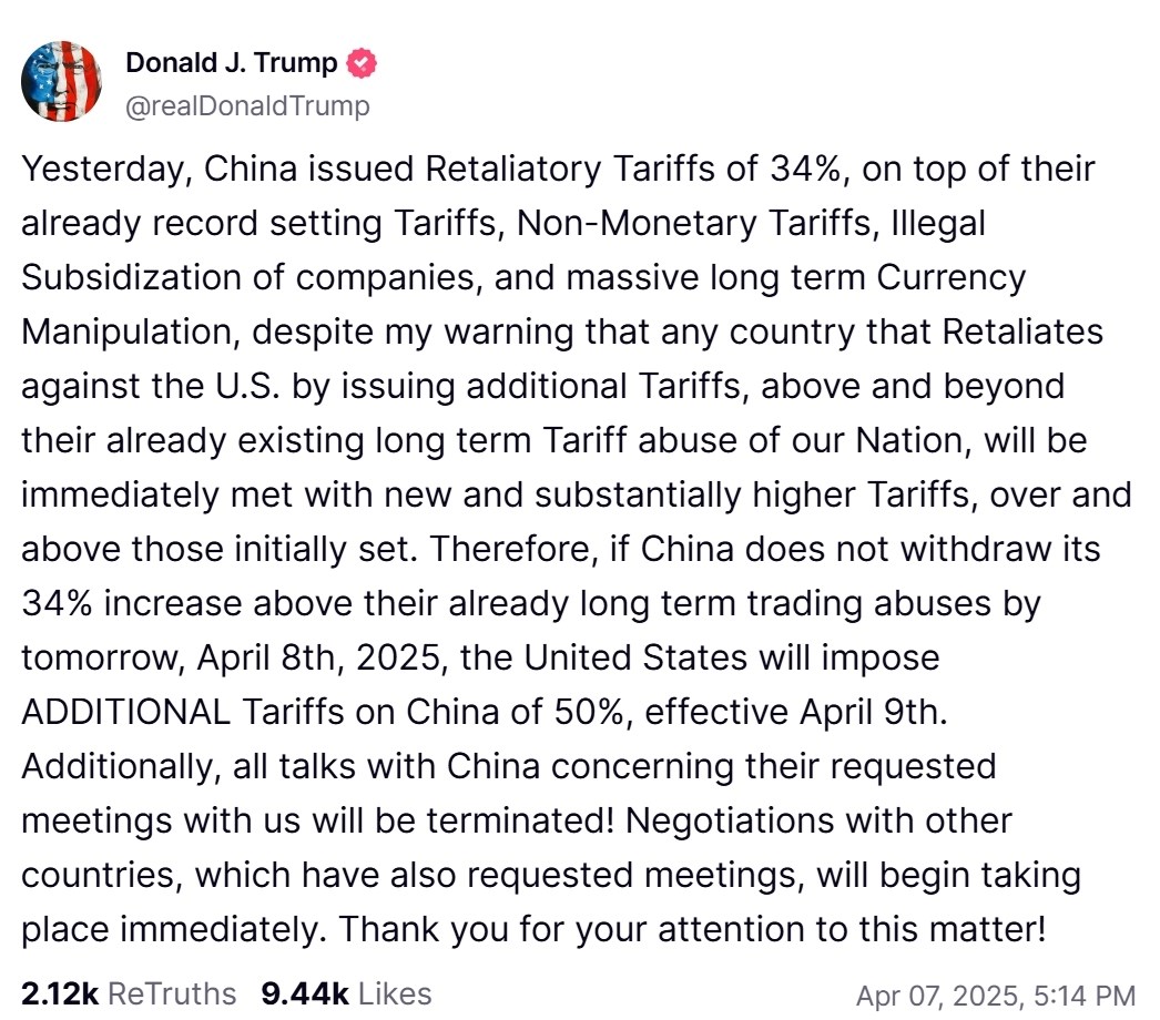 Američki predsjednik Donald Trump rekao je da će uvesti dodatne carine Kini od utorka, ako Peking ne povuče svoje carine od 34 posto za odmazdu SAD-u.