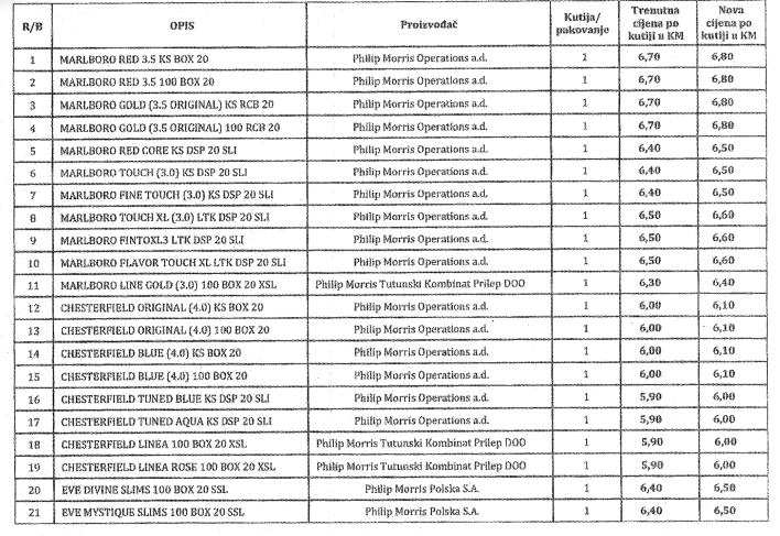 Kompanija Philip Morris BH d.o.o. Sarajevo obavijestila je javnost da su od ponedjeljka, 30. juna 2025. godine, na snazi nove maloprodajne cijene cigareta iz njihovog asortimana.