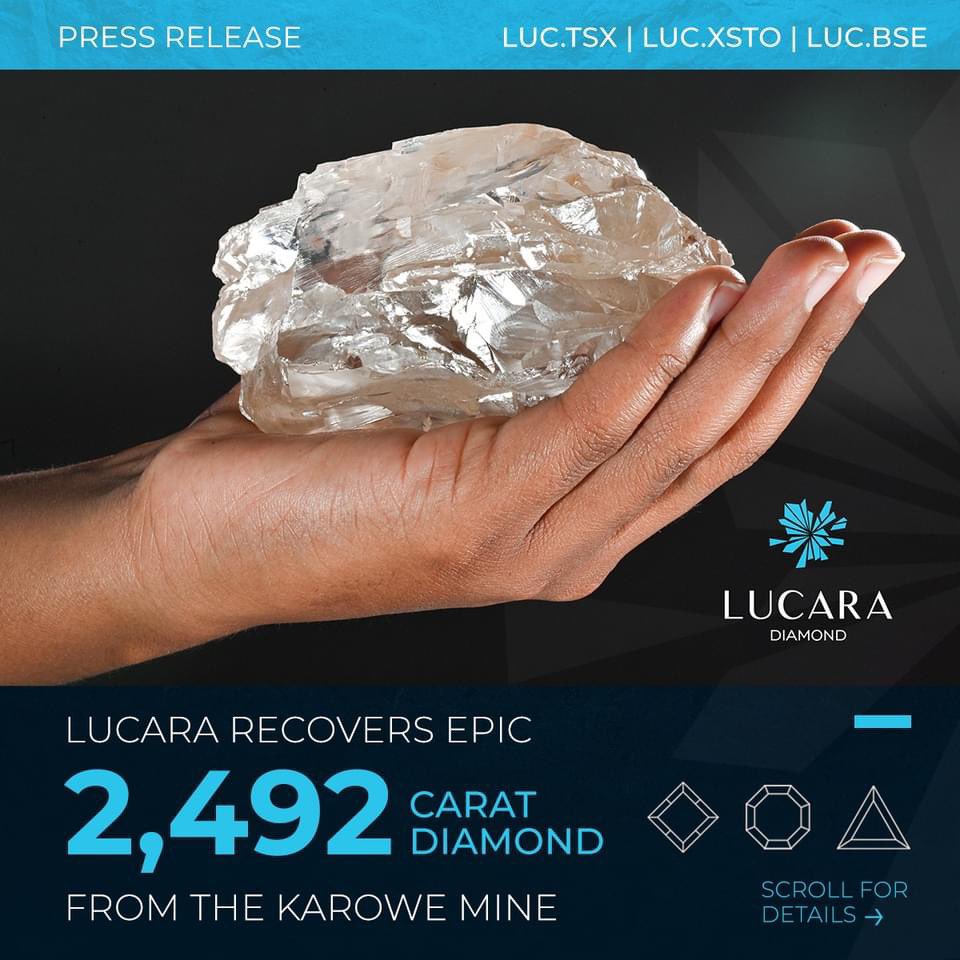 Kanadska kompanija Lucara Diamond Corp pronašla je dijamant od 2492 karata u svom rudniku Karowe u Bocvani, jedan od najvećih dijamanata koji je ikada iskopan, saopćila je kompanija.