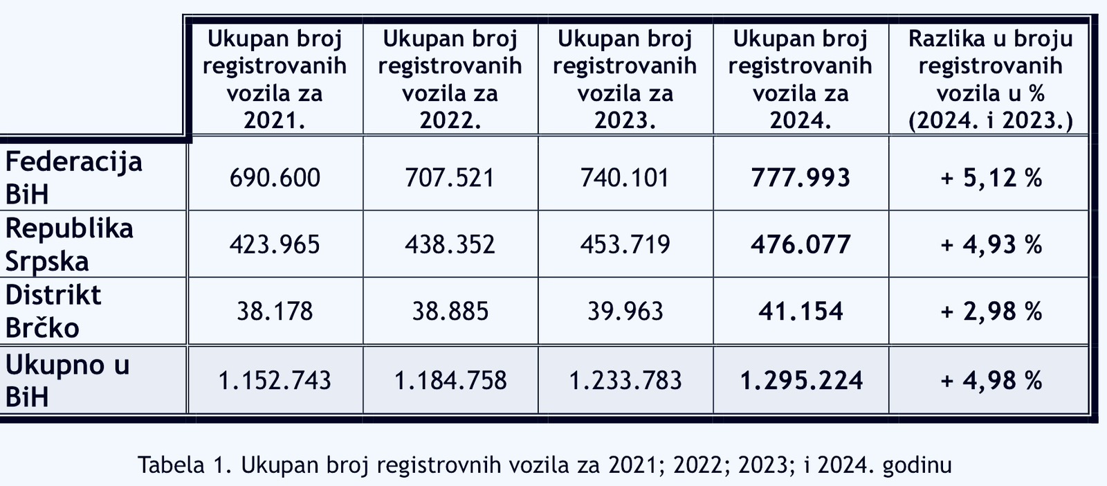 Inače, u protekloj godini u Bosni i Hercegovini ukupno je registrovano 1.295.224 cestovnih vozila, što u odnosu na 2023. godinu predstavlja povećanje od 61.441 vozila, odnosno od 4,98%.