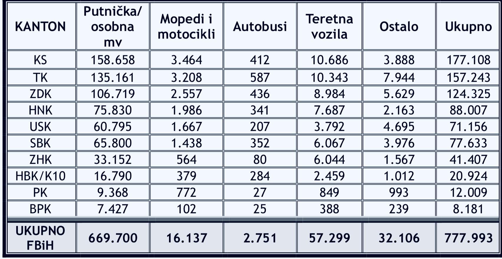 U tabeli ispod možete vidjeti detaljan prikaz broja registrovanih motornih i priključnih vozila po kategorijama i po kantonima u FBiH u 2024. godini.