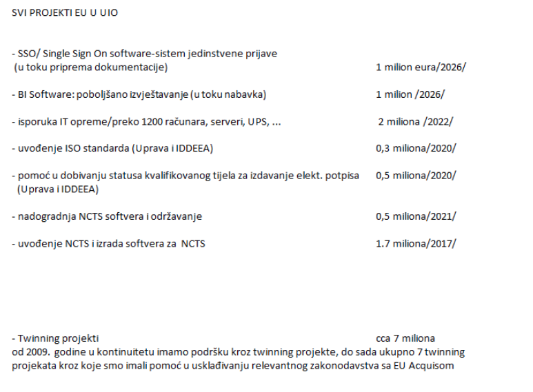 Takođe, planirano je unapređenje i uvođenje novih elektronskih usluga i servisa koje pruža UIO vezano za carinski i poreski podsistem, a poduzimaju se značajni koraci ka uvođenju bespapirnog poslovanja poslovne zajednice sa UIO.