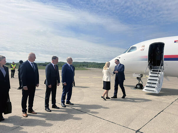 Predsjedavajuća Predsjedništva BiH Željka Cvijanović dočekala je predsjednika Srbije Aleksandra Vučića na banjalučkom aerodromu Mahovljani.