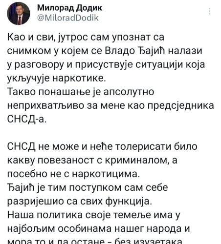 Brzina reakcije pokazuje da je sve unaprijed bilo spremno i organizovano uz vrha režima, a munjevito objavljen „tvit“ i Saopštenje Milorada Dodika da je Đajić uklonjen sa svih pozicija jer je drogiranje tobože za njega neprihvatljivo potvrda je ko stoji iza objave snimka i operacije uklanjanja Đajića.