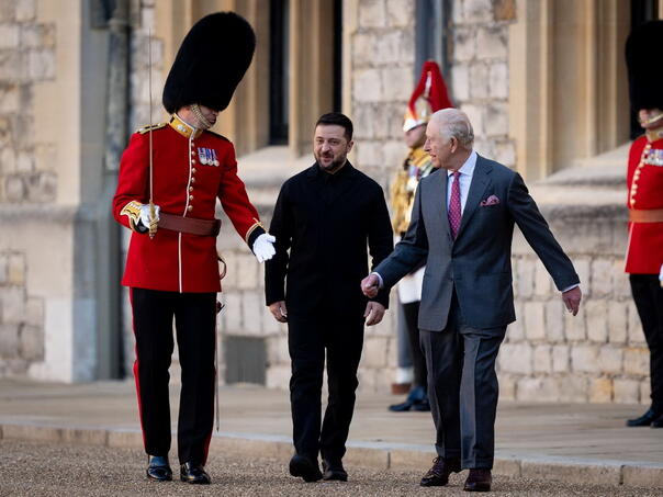 Ukrajinska himna odsvirana je u skoro 1.000 godina starom dvorcu Windsor zapadno od Londona, gdje je Zelenski uveden unutra na audijenciju s kraljem na njihovom trećem sastanku ove godine.